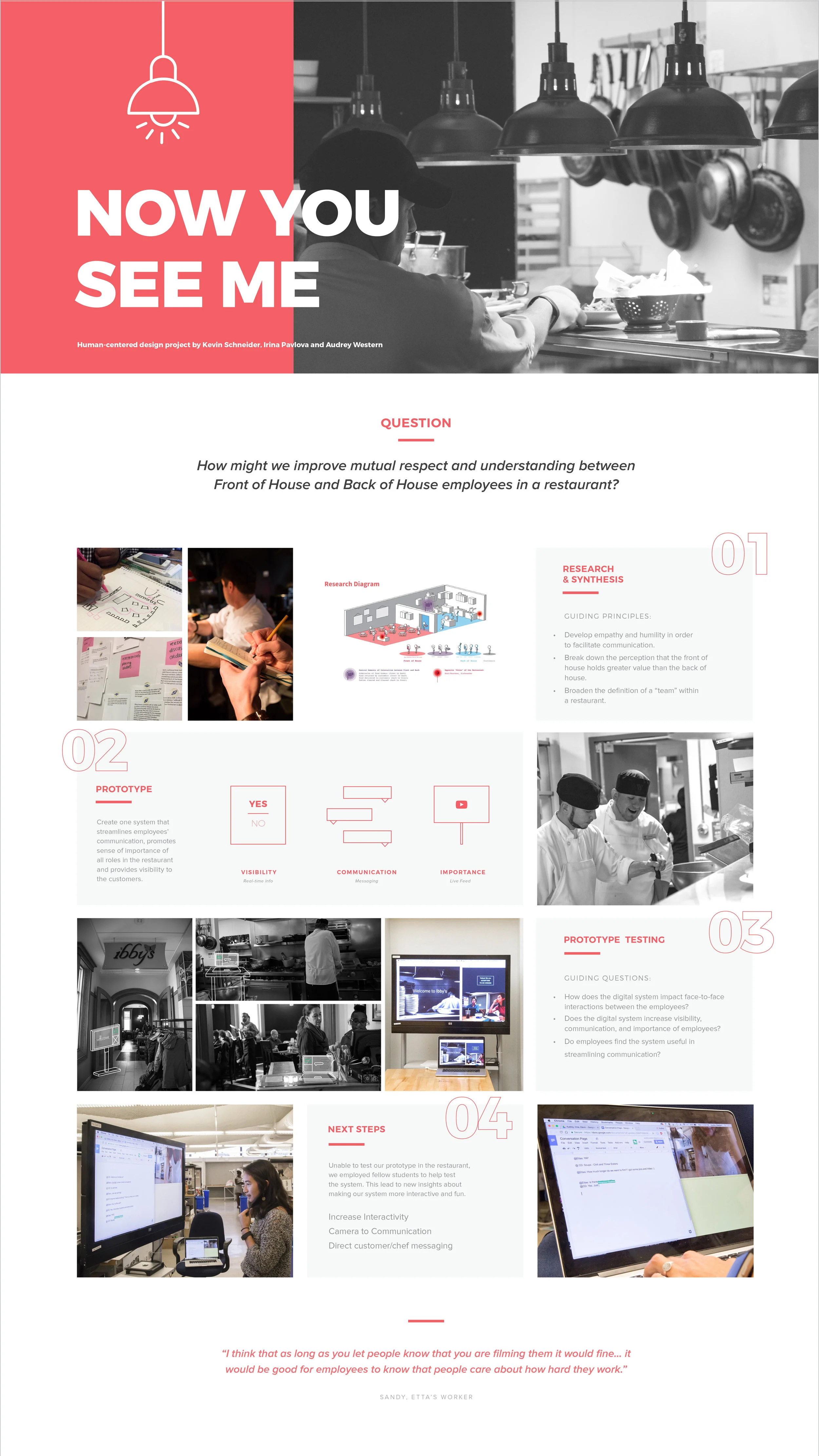 Spring of 2017 I took a class called Research Methods in Human Centered Design, which focused on designing and learning for peoples' needs and perspectives in the context of the restaurant. Working in groups, we followed a human-centered design process, beginning with planning and conducting in-context interviews, observations and co-creation activities, learning how to uncover latent knowledge in the context of front-of-house and back-of-house restaurant relations. We synthesized insights in order to inspire design ideas, prototyped these ideas in order to answer specific questions, and ended up designing new iterations. We discussed the broader landscape of design research, including ethnography, participatory and speculative design, and evaluative methods, examining critiques and benefits of different approaches. After lots of ideation, Now You See Me, was developed: a communication system to improve communication and mutual respect for front-of-house and back-of-house employees.