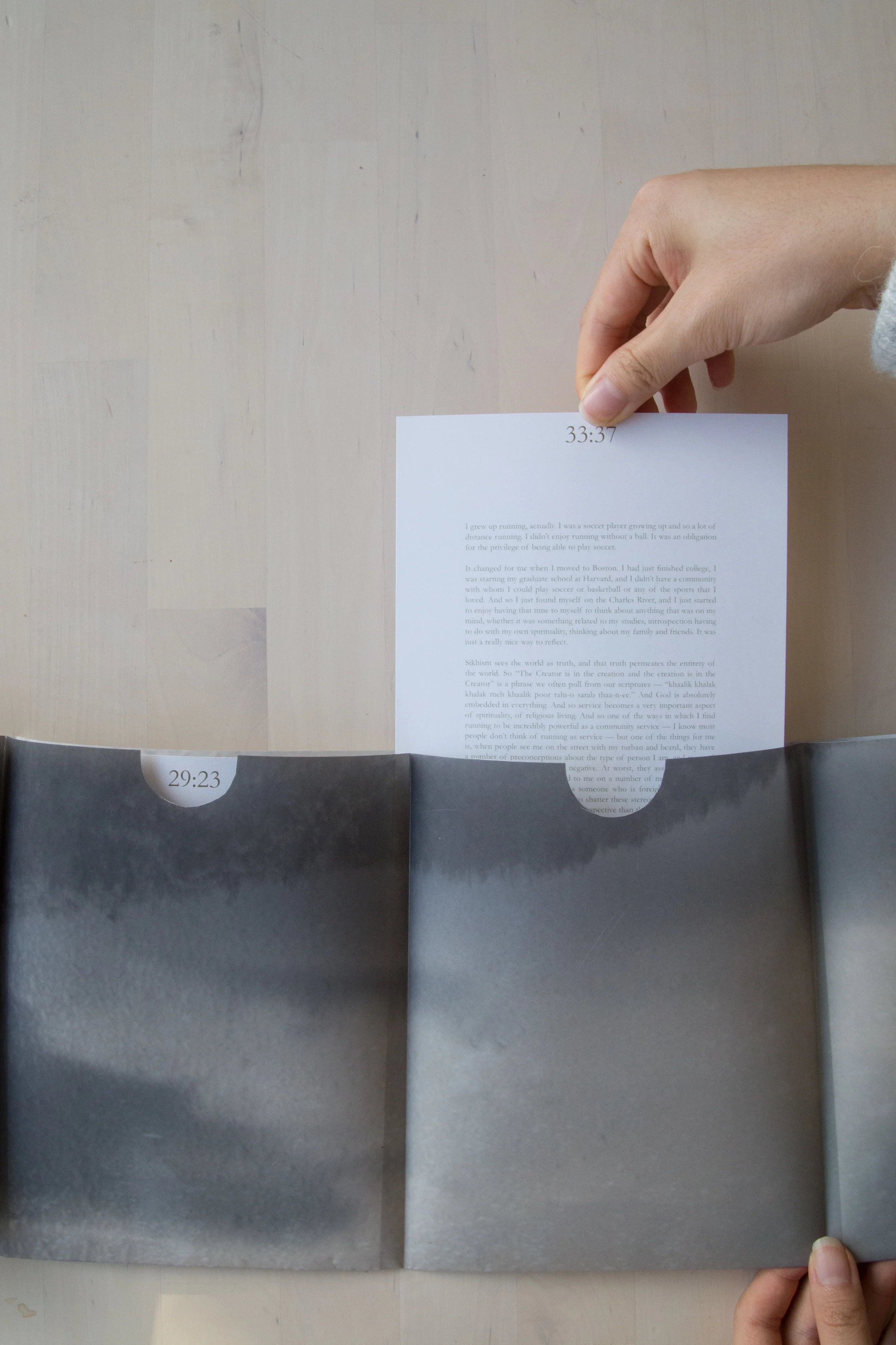 Podcasts have become an increasingly popular way to disseminate and consume information. Part of the challenge of creating an audio podcast or radio show is to successfully communicate an idea or topic without the aid of pictures or text. This project flips that coin: how can you create a visual experience out of something originally designed to be heard? I selected the audio podcast "Running as Spiritual Practice" from the podcast, On Being.